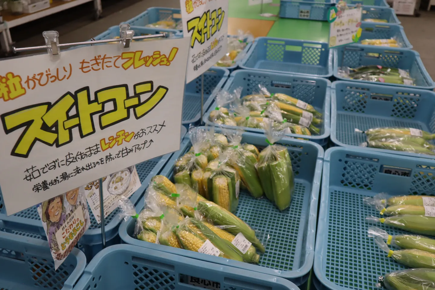 その日に採れた新鮮な地元野菜が並ぶ産直市場で、休日には広い駐車場がいっぱいになるほど人気です。入店した瞬間に、鮮やかなイエローのスイートコーンがずらっと並んでいるのが目に入りました。美味しい食べ方やレシピが書かれたPOPが掲示されていて、お買い物の際とても参考になります。