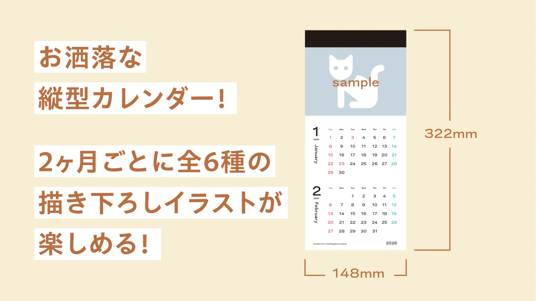 カレンダーは、幅148mm×高さ322mm。縦に長く、スタイリッシュでお洒落な印象の形です。2ヶ月が1枚になっており、表紙+6枚の描き下ろしイラストが添えられます。