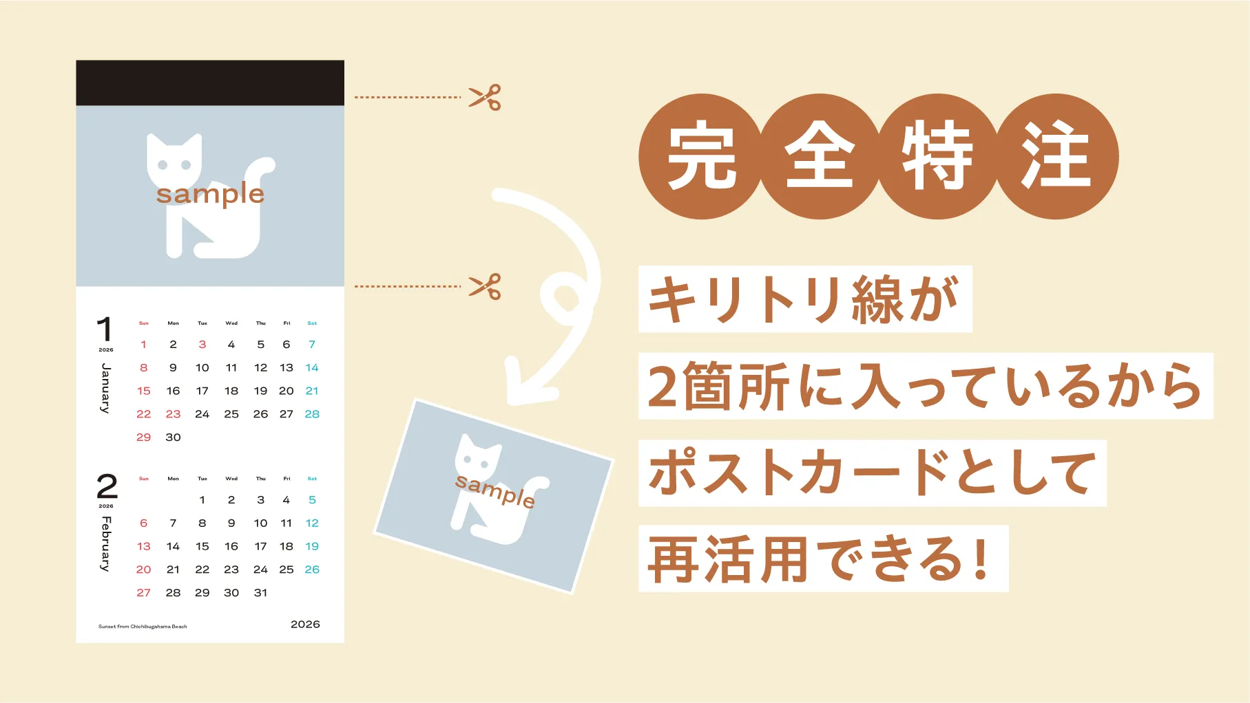 他のカレンダーと異なるのは、イラスト部分に2本のキリトリ線が入っていること。イラスト部分を切り取って、ポストカードとして使うことができます!サイズも幅148mm×高さ100mmと、ハガキと同じサイズになります。 イラストレーターさんに描き下ろしていただいた特別な三豊イラストを、長く楽しんでいただきたい・・・。そんな想いから、地元の印刷業者さんにお願いしてつくりあげた完全特注の規格です!