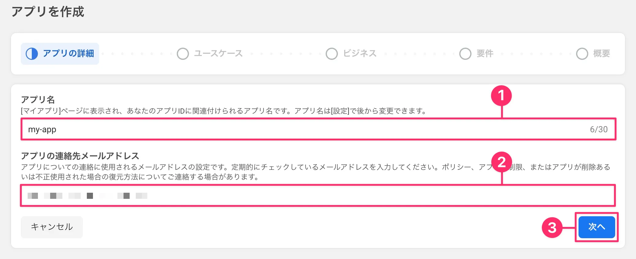 - 「❶ アプリ名」と「❷ アプリの連絡先メールアドレス」にそれぞれ任意のアプリ名とメールアドレスを入力し、「❸ 次へ」をクリック