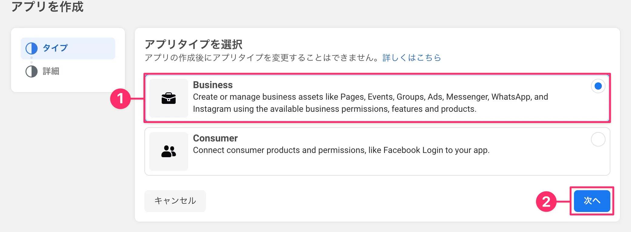 - 「アプリタイプを選択」では「❶ Business」を選択し、「❷ 次へ」をクリック