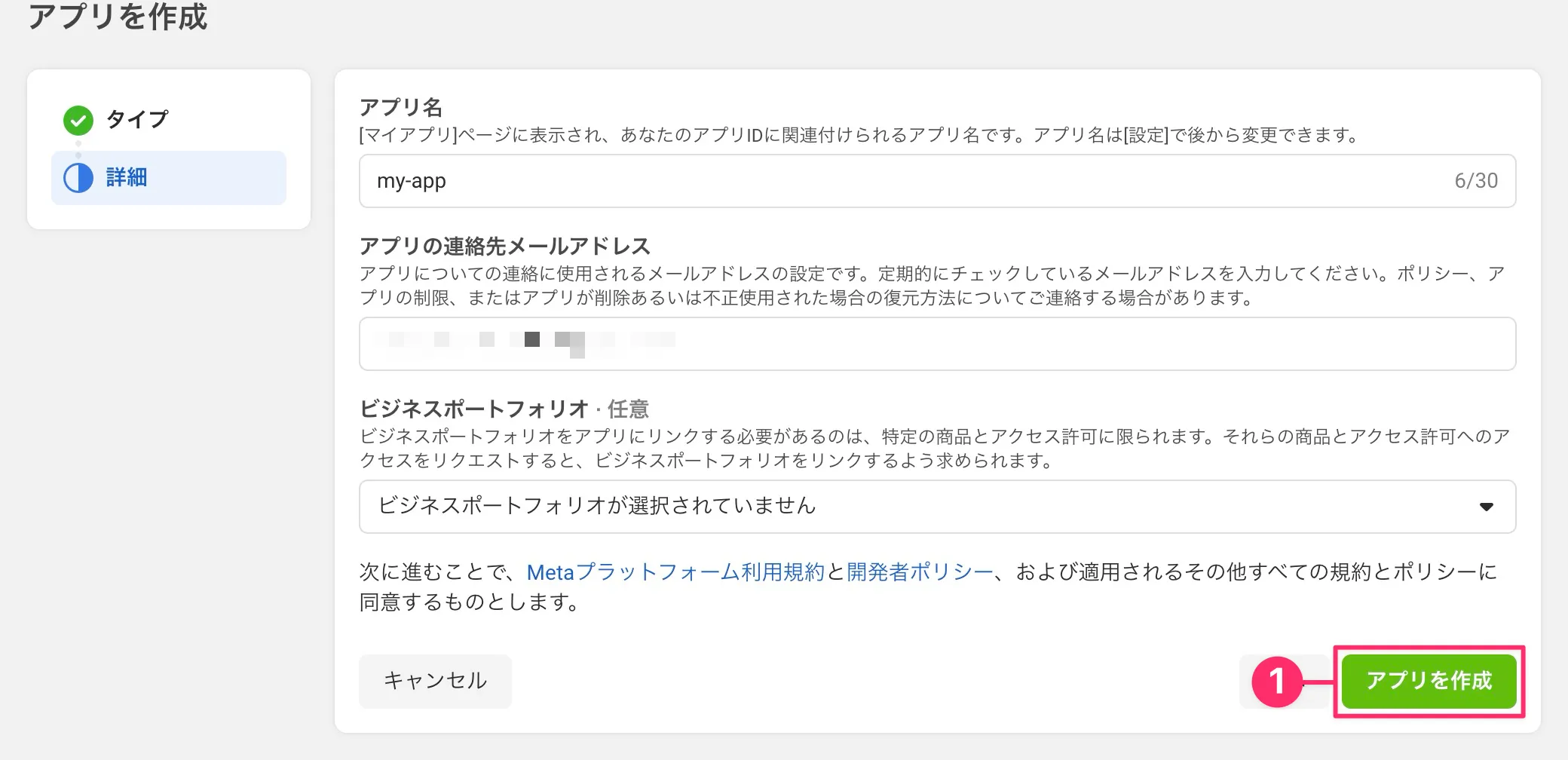 - これまでの入力内容を確認し、問題なければ「❶ アプリを作成」をクリック