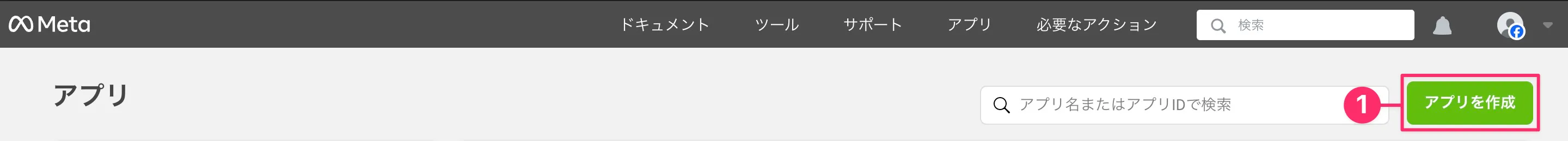 - Meta for Developersにログイン後、右上の「マイアプリ」をクリックしてアプリ管理画面に移動