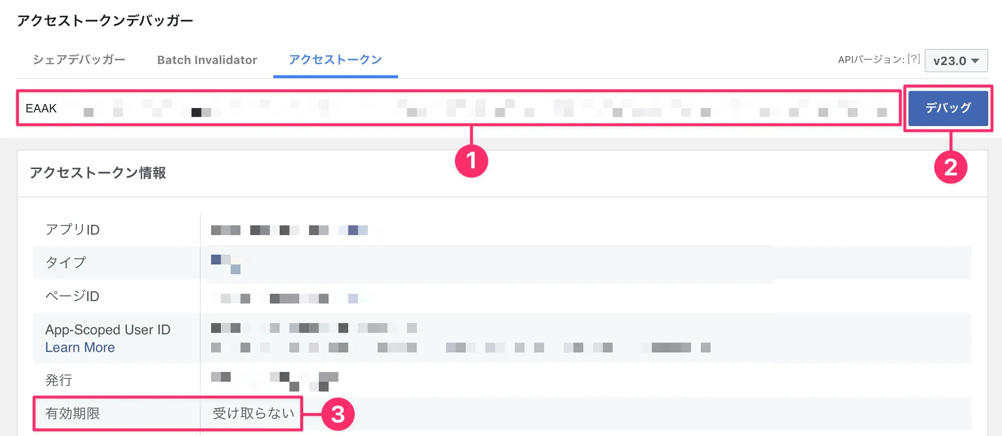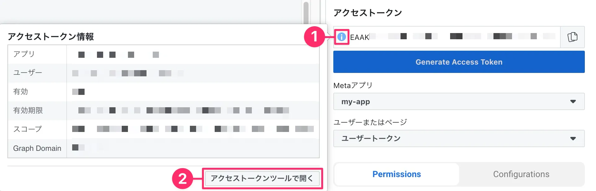 - アクセストークン左のアイコン(❶)をクリック、続いて「❷ アクセストークンツールで開く」をクリックしてアクセストークンデバッガーにアクセス