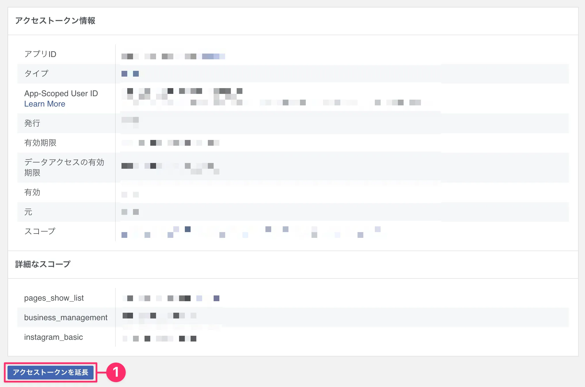 - アクセストークンデバッガーの「❶ アクセストークンを延長」をクリック