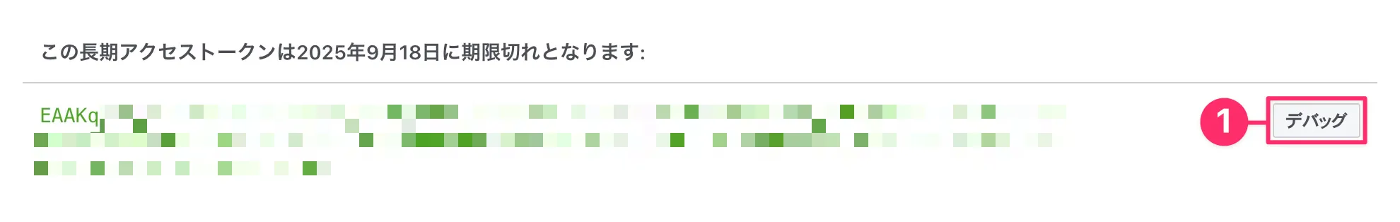 - 有効期間2ヶ月の長期トークンが生成される。「❶ デバッグ」をクリックして長期トークンのデバッガーを開く
