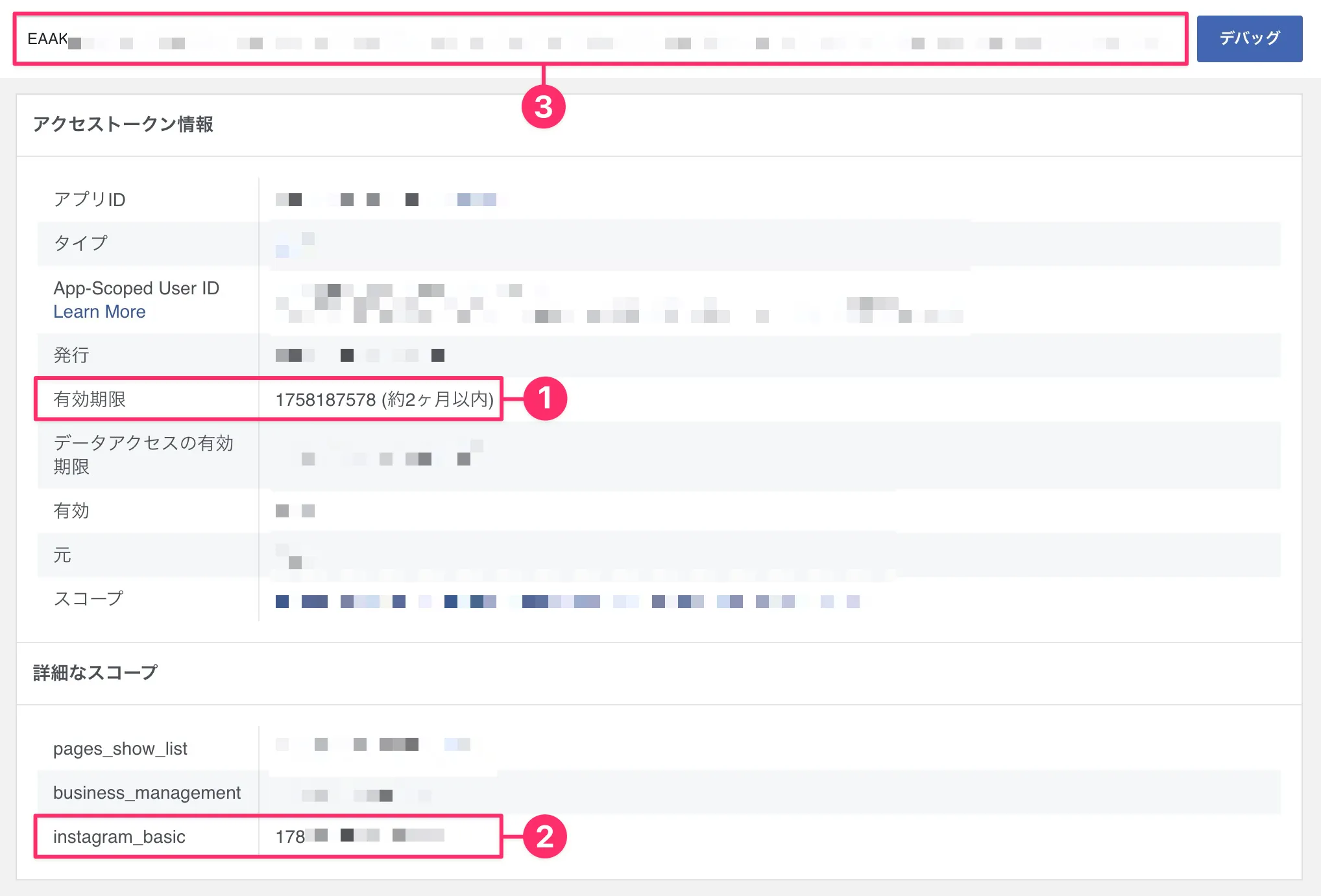 有効期限が2ヶ月になっていることを確認する(❶)instagram_basicの値(❷)はこのあとでInstagramビジネスアカウントIDとして使用する。コピーして控えておく- 長期トークンをコピーする(❸)