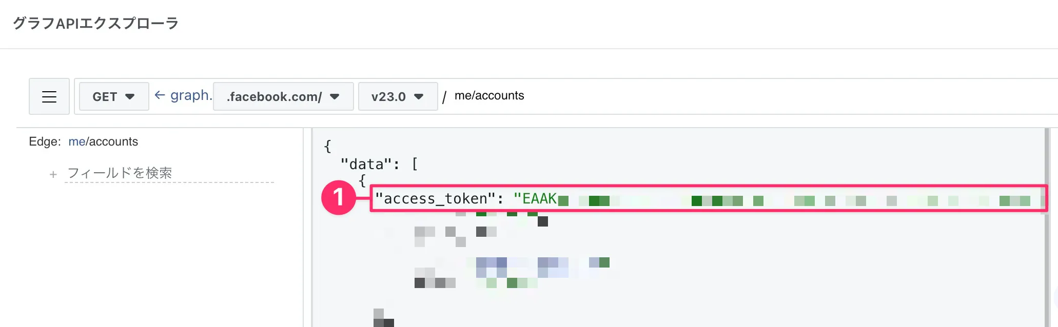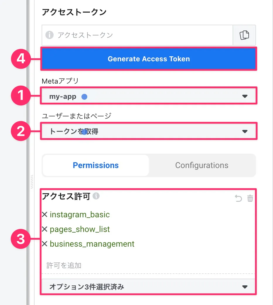 - 「アクセストークン」に長期トークンをペーストする(❶)